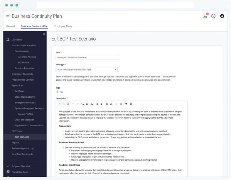 Manage your BCP testing program by planning, executing, evaluating, and documenting tests.