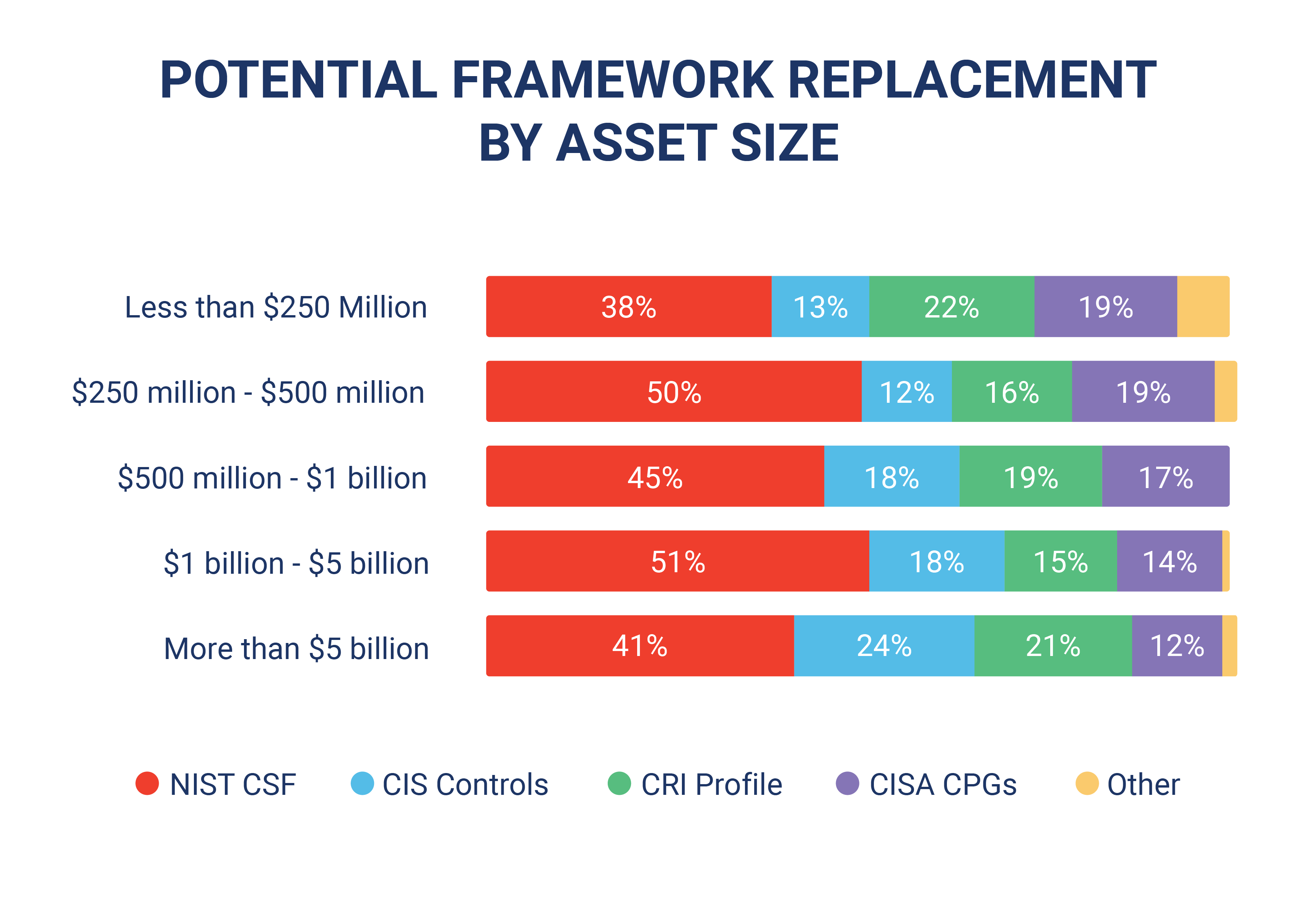 Across all asset sizes, the NIST CSF consistently came out on top. Institutions in the $250–5 billion ranges showed the highest preference for NIST CSF, with nearly three quarters or more indicating it as their likely choice.