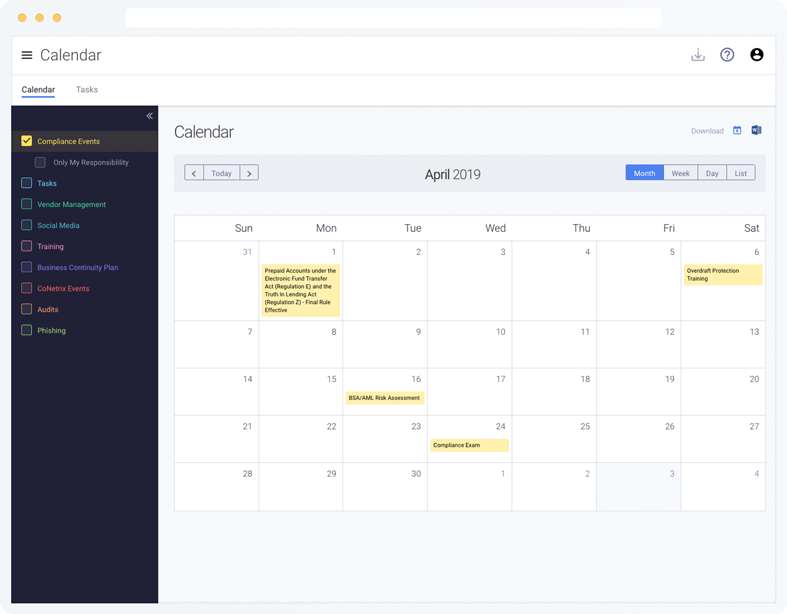 The calendar provides visual insight into scheduled compliance dates, allows users to easily access upcoming events, and includes iCalendar and Microsoft Word export options.