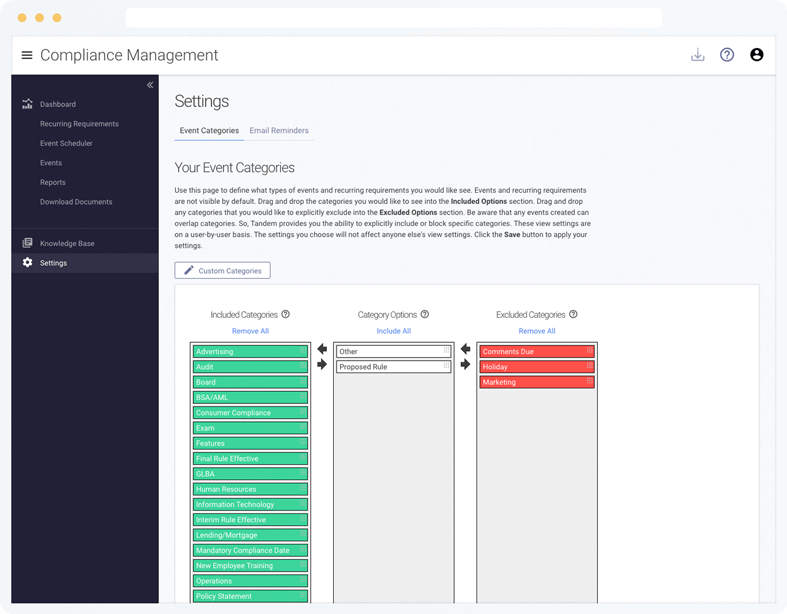 Manage all of your organization's compliance events in a central location. Events are categorized based on purpose and content.