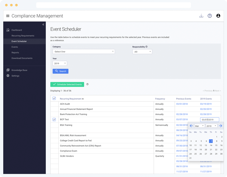 Identify, schedule, and track important compliance dates, including reporting, audits, training and operational events. Set due dates and monitor the status of your individual and recurring requirements to help ensure regulatory compliance.