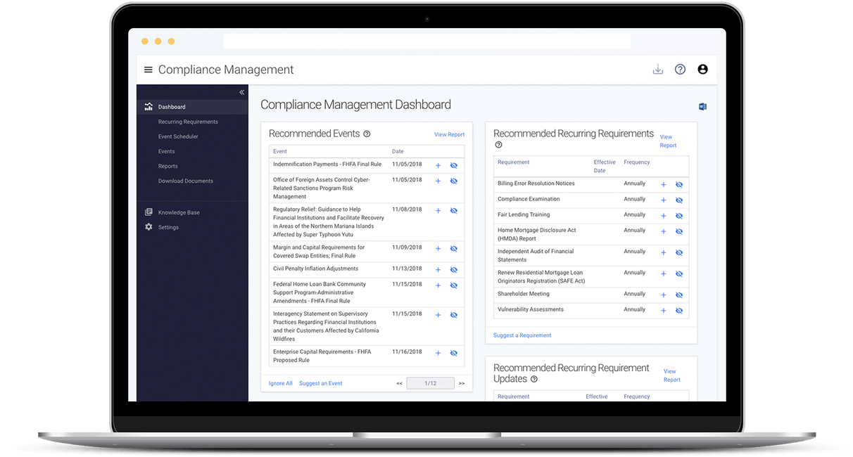 Recommendations include events such as proposed rule comment periods, final rule effective dates, and guidance that may affect how you conduct business. Recommendations displayed to you are filtered based on your category settings and your financial regulator.