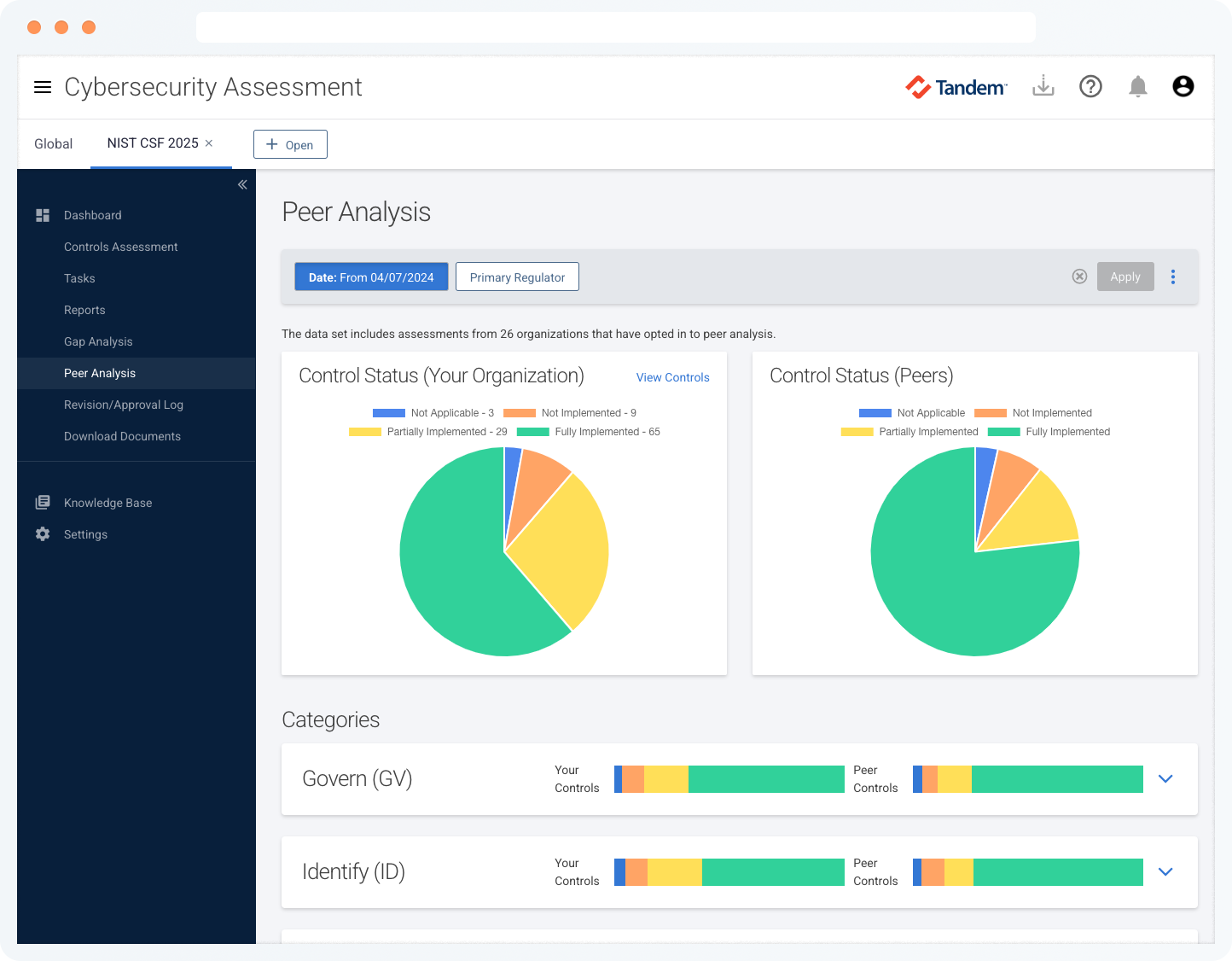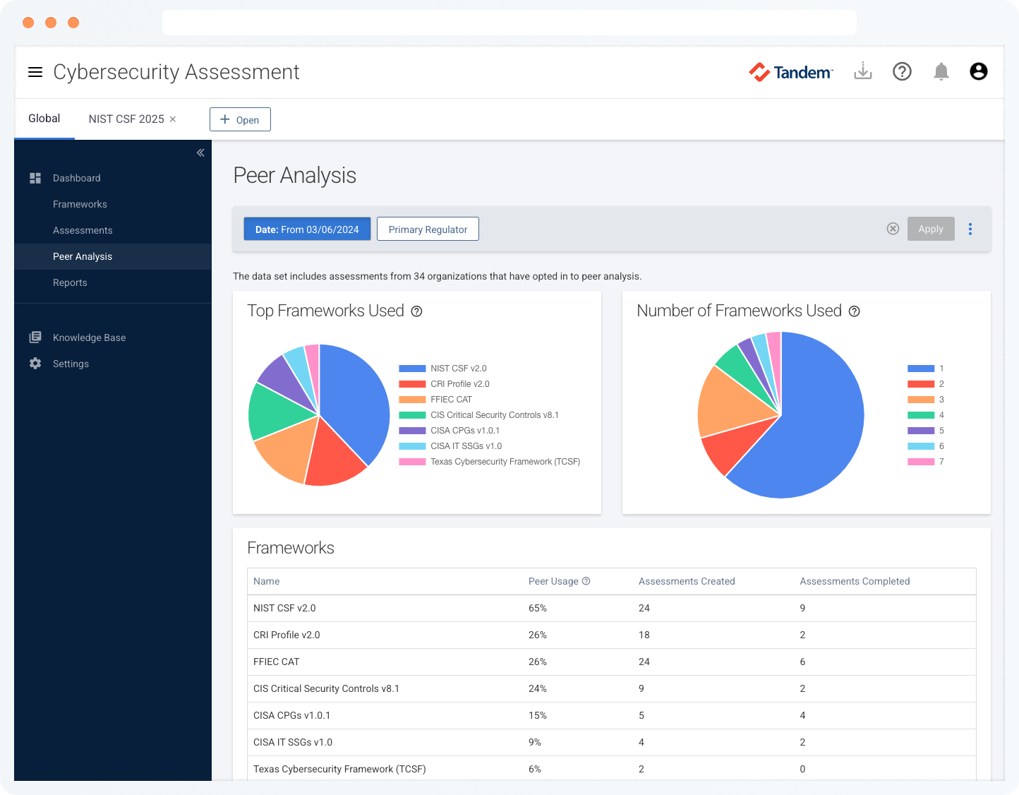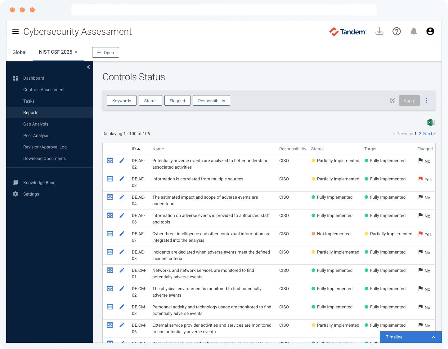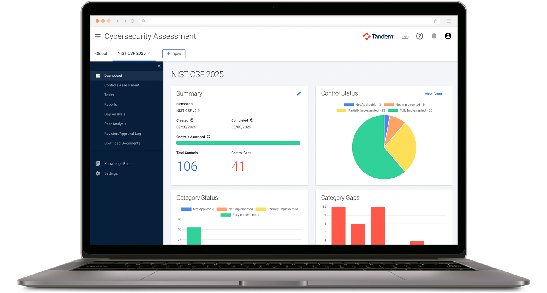 Tandem streamlines the compliance process, helping you benchmark and assess your organization's security posture against common cybersecurity control frameworks.